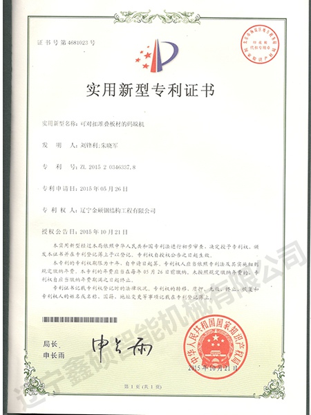 Utility model certificate of palletizer for stacking plates